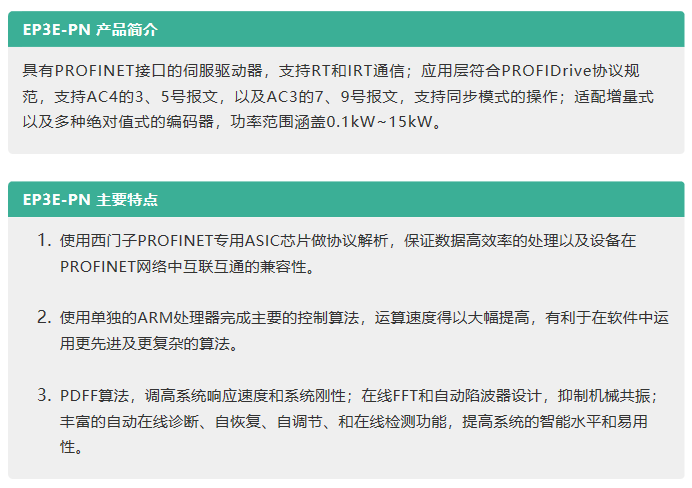同時(shí),作為國(guó)內(nèi)首家成功研發(fā)出PROFINET伺服并支持PROFIDrive行規(guī)的伺服廠商,我們將為用戶帶來集穩(wěn)定可靠與高性價(jià)比于一身的EP3E-PN PROFINET總線伺服系統(tǒng)。