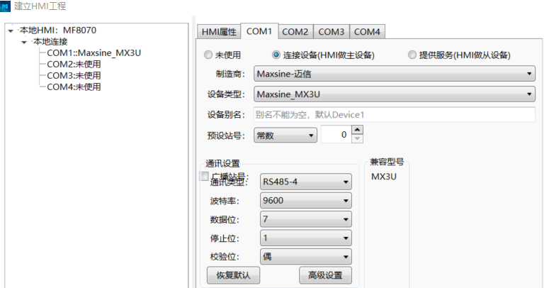 打開組態(tài)軟件“Maxsine Interface 2”新建工程,配置HMI與PLC的通訊參數(shù)如下圖: