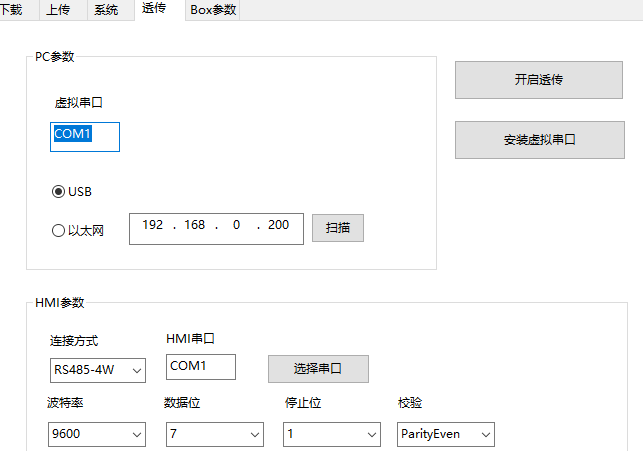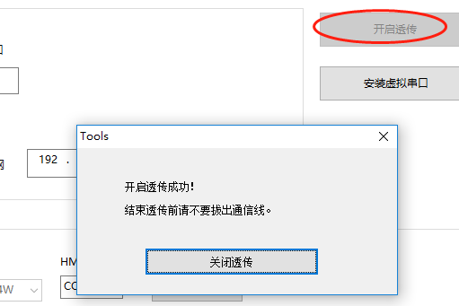 開啟透傳,配置好透傳參數(shù)后點擊開啟透傳,此時HMI處于傳輸模式下,不能進行任何操作,透傳過程中不能關(guān)閉該窗口或者拔出通訊線。